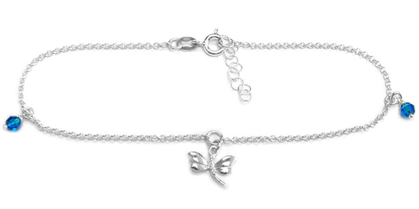 1.2 mm, 925 sterling silver rolo chain anklet with dragonfly charm and dangle blue cz stones