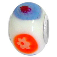 Wholesale silver jewelry - Flowers on orange and blue spots glass bead with 925 sterling silver caps for 3 mm chain European modular charm bracelets and necklaces.