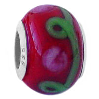 Wholesale silver jewelry - Green stem and pink flowers on red glass beads with 925 silver caps for 3 mm chain European modular charm bracelets and necklaces.