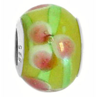 Wholesale sterling silver jewelry - Pink flowers with green stem glass beads with sterling silver caps for 3 mm chain European modular charm bracelets and necklaces.